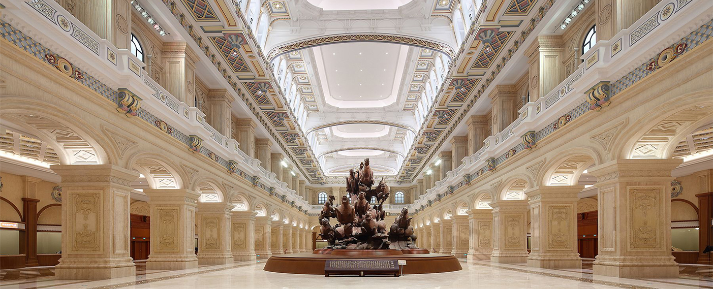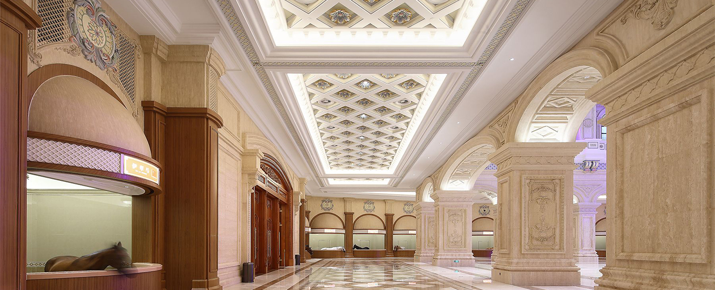 为了增加游客的观马体验,确保观众正确辨别各地名马的细部特征,我们在名马的“豪华单间”内、观赏名马的走廊通道上设置了合理的灯具。建筑中庭空间高度达23米,为了让光线集中到雕塑上,在中庭顶部安置的射灯需要极窄的光束角和较高的中心光强,最终采用了定制版15°角窄光束射灯,配合空间的古典西洋风格,整个空间中选用3000K色温,选用无眩光灯具,灯具隐藏在天花顶的花瓣装饰内,繁复的吊顶被间接照明洗亮,整体空间见不到刺目光点,光环境和谐统一。
