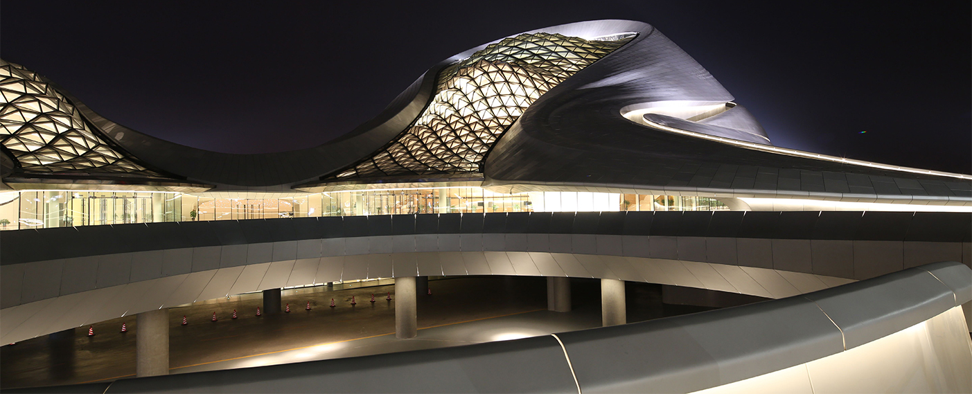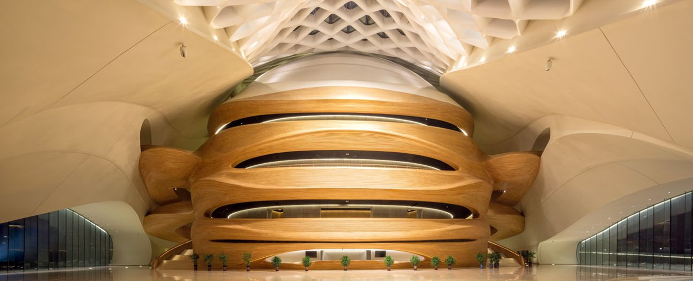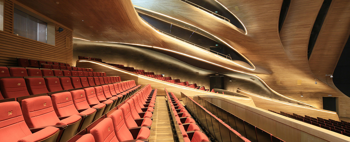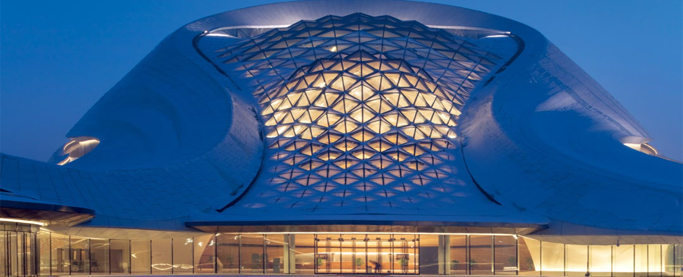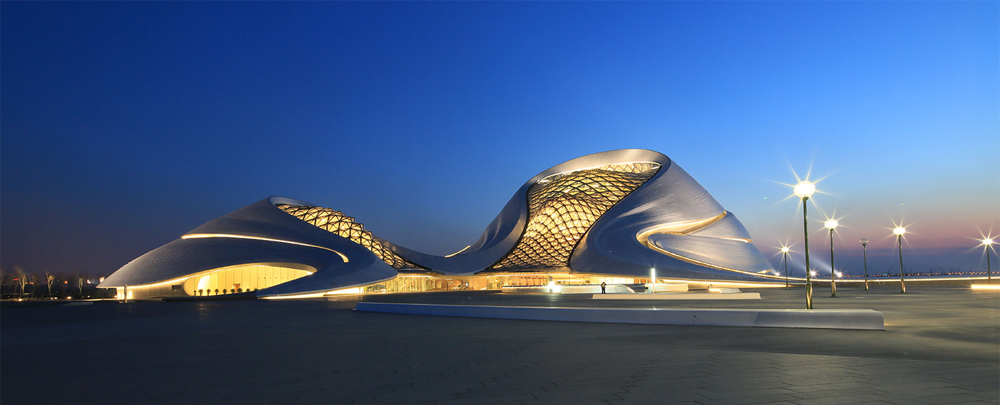 哈尔滨大剧院位于哈尔滨市松北区文化中心岛内,包括大剧院(1600座)、小剧场(400座)、地下车库及附属配套用房等。外部围护结构为钢结构壳体,采用了异型双曲面的外型设计,是哈尔滨的标志性建筑。2016年被评为世界最美建筑。