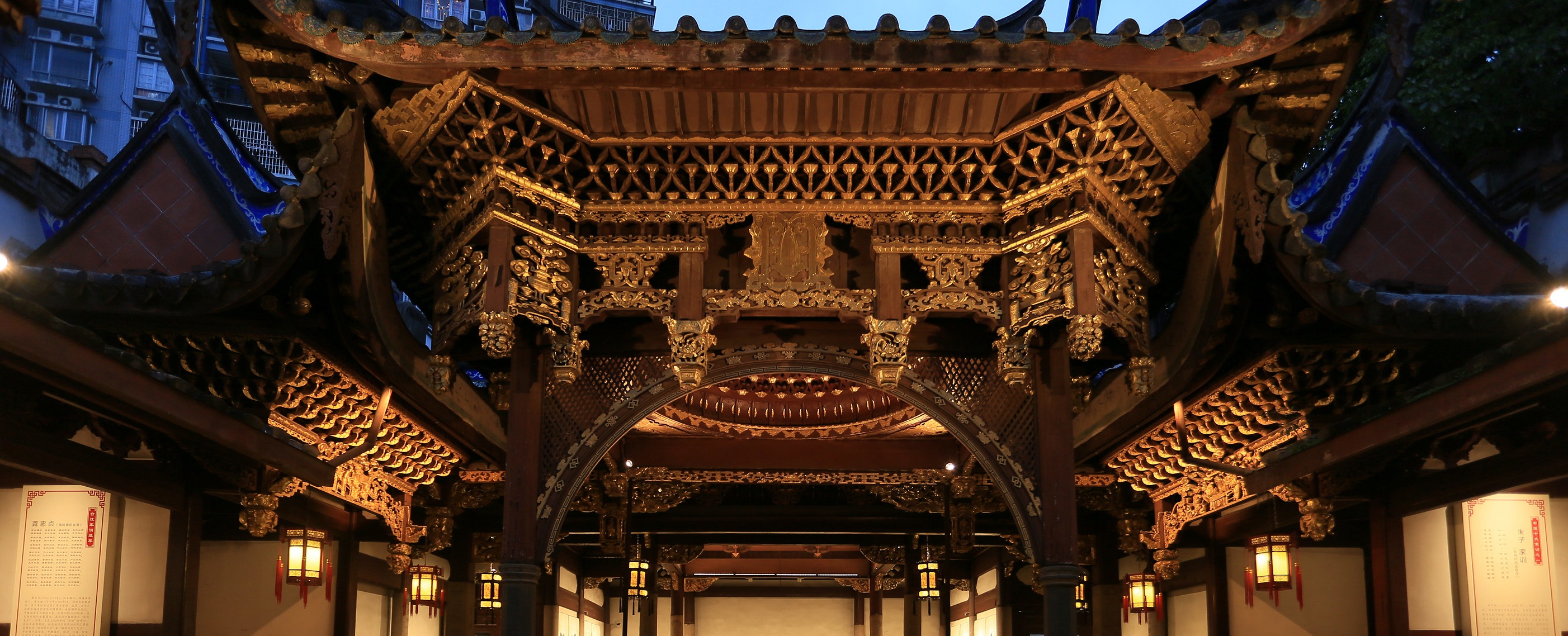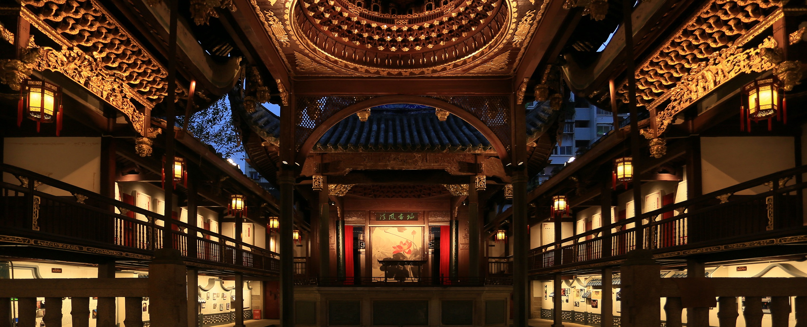古田会馆是传统的院落结构,从入口、一层廊楼、中庭、正殿,在自然环境下,空间光的秩序是暗-明-暗,功能调整后,一层廊楼及正殿被赋予了更多的展陈要求,故空间光的分布也需要重新规划。首先,我们通过线性照明,洗亮一层廊楼立面,既提供展陈效果,又通过连续的光,引导观众穿过中庭到达正殿。其次对正殿区域原有灯笼进行改造,每支灯笼增补四套5w筒灯,分别上下照射,表现顶部梁架并补充台阶功能照明。之后,重点通过轨道灯对正殿立面及展品进行表达,弱化中心休憩区,营造主次清晰,明暗有致的主体氛围。