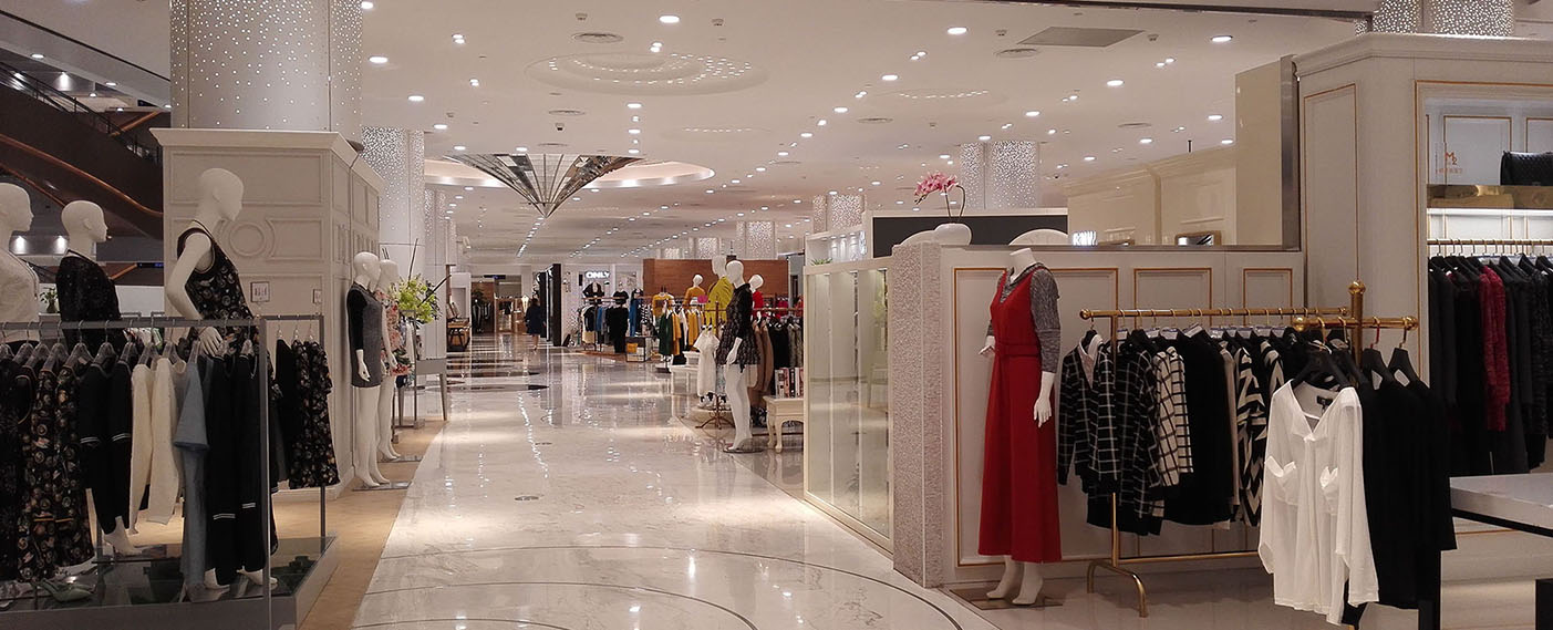 在商场空间中,通过光的强度、照明方式、布置方式等手段可以改善或强化空间尺度、层次、围合度、开放性等重要的空间要素,进而提升空间的体验感和舒适性。新世界大丸百货的天花覆盖空间照明设计,通过图案化的照明设计,增加了入口处的空间开敞感。店铺中间的天花造型,利用小功率射灯打亮,使消费者在眺望店铺整体的时候进入视线,加深百货店铺的印象。在照明设计师的眼中,光是空间的第四维度,在光的演绎下,商业空间会更富于层次、色彩和变化。