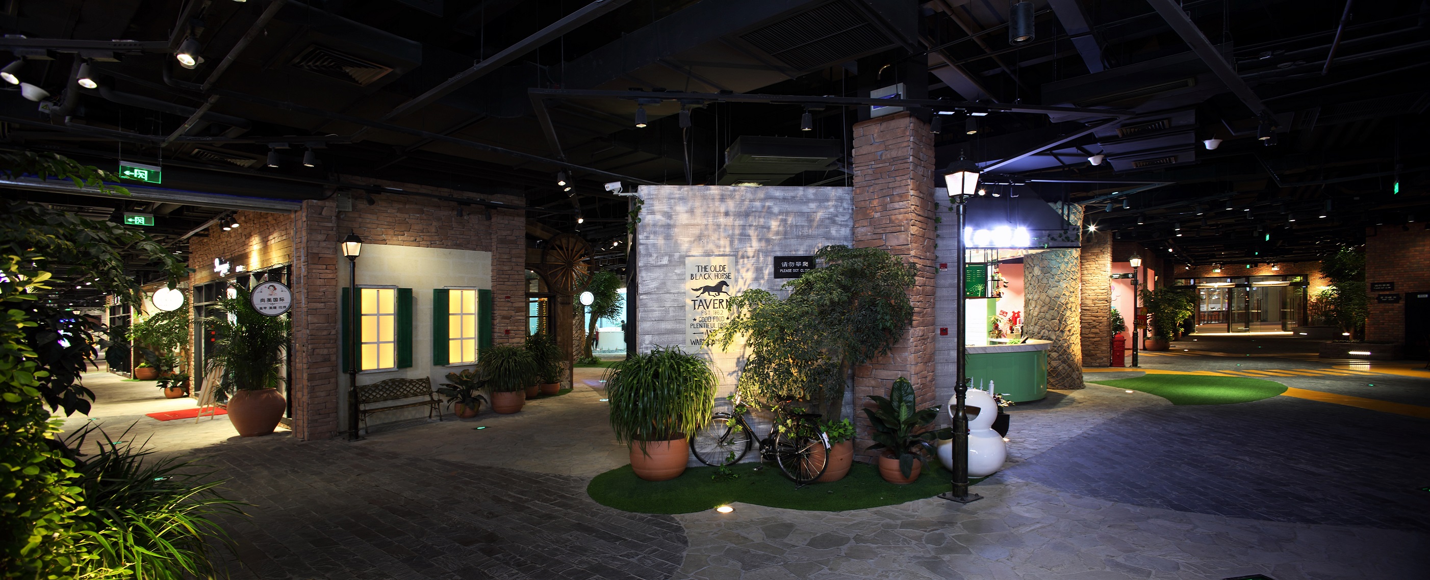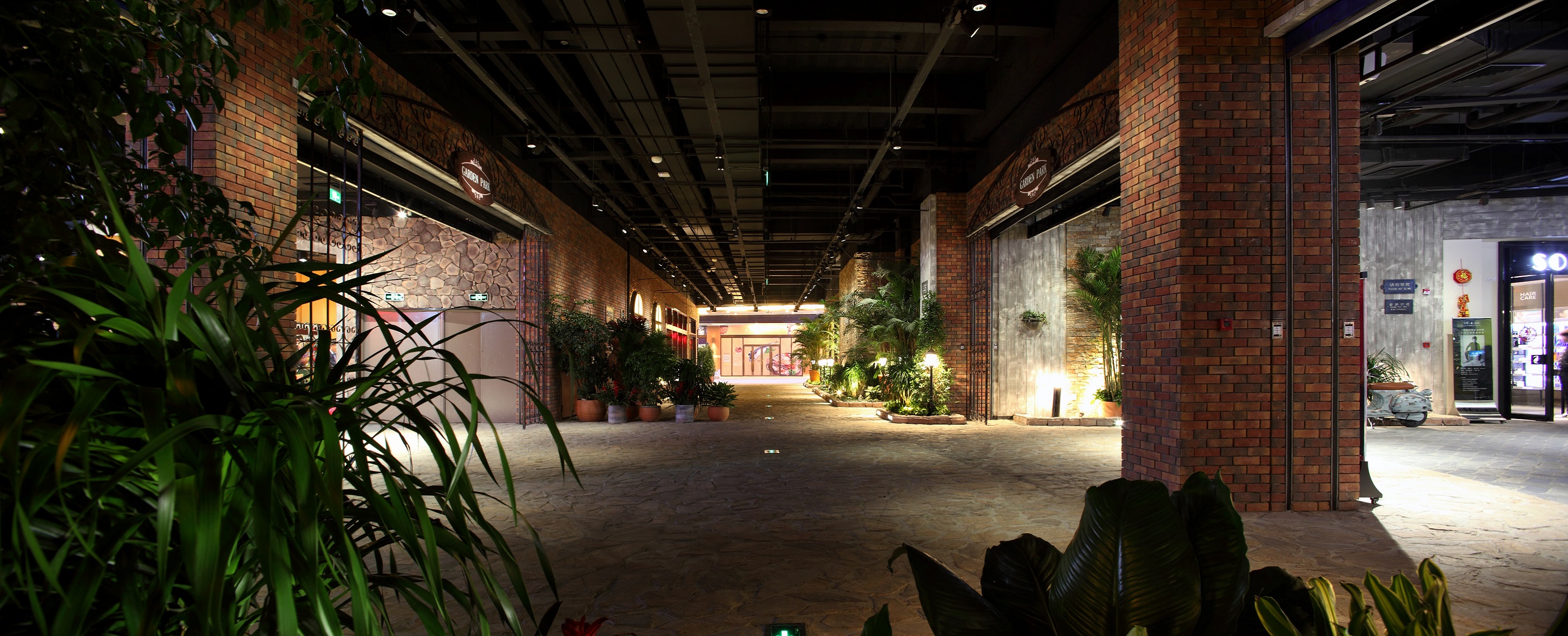 小镇内景的材料运用复杂,颜色以绿色为主,混入了各种鲜艳的色彩,立体绿植墙,各种尺度的花盆盆栽,花坛,室内水景,喷水池等。面对多元素空间,逆向而行,思考一种“简单”的处理方式。通过安装节点的处理/调光控制也可呈现出满意的设计效果。运用轨道灯具产品照明,看似复杂,其实为一种元素的不断变化产生不同的场景。