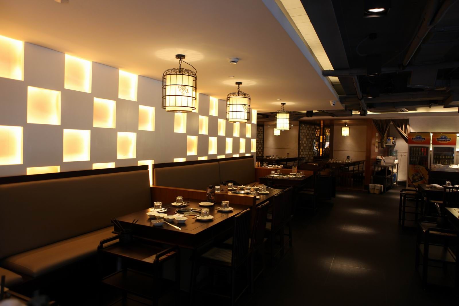 捞王致力于推广“绿色”“健康”“营养”饮食文化,始终坚持“绿色,无公害,一次性”的选料和底料熬制原则。这就要求餐饮的灯光可以营造与其文化相一致的氛围。黑色高雅的木质桌椅、中式气质的装修风格、现代时尚的皮质靠背沙发,木质的酒架,在极成LED AR111光源的格栅灯下显得干净整洁,高雅舒适,十分讲究。GT4060投下的光斑均匀可见,无形中实现区域划分,拥有层次感;射灯LED光源MR16重点呈现餐桌上秀色可餐的美味,顾客可尽情享受。