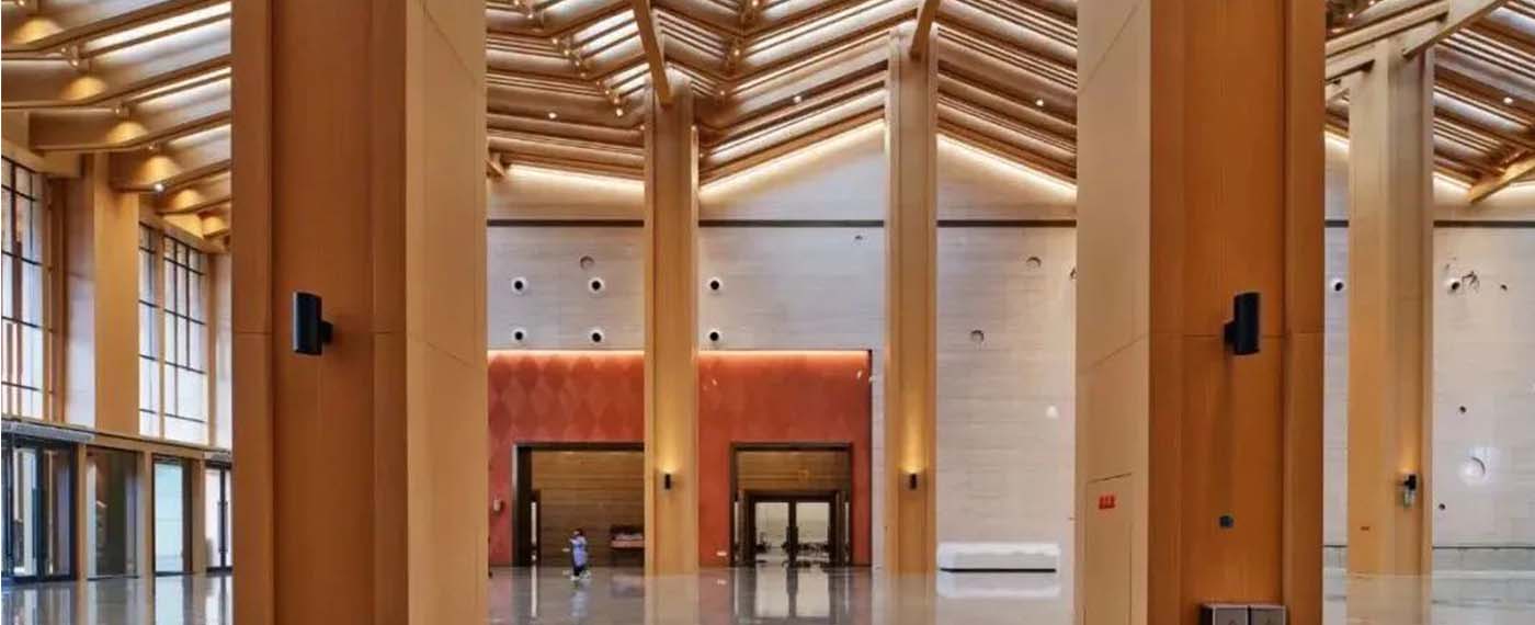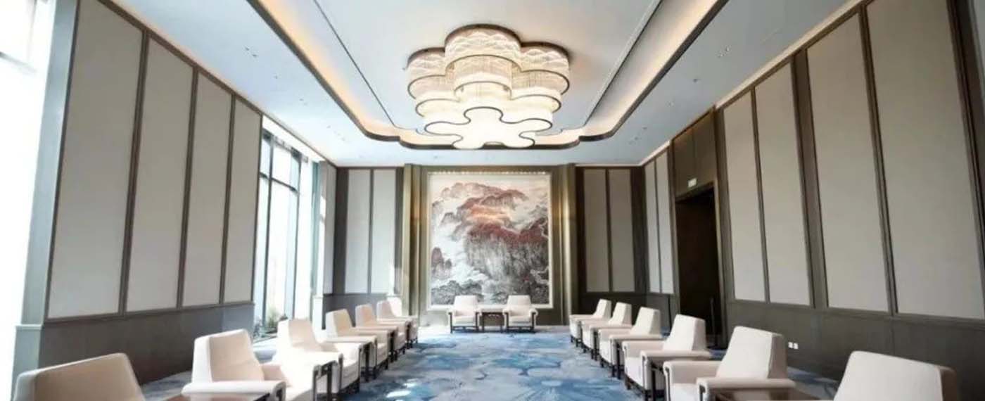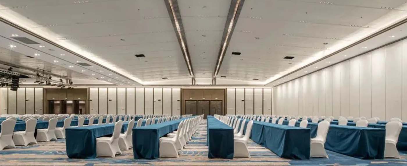 大型的多功能厅设计场地开阔,高品质灯具井然有序地排布在天花上,采用一般照明和局部照明相结合,灯光照亮厅内每一处的角落