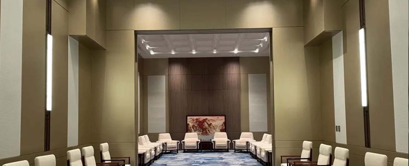 小型会议厅灯槽采用暗藏灯光做局部照明,把光源隐藏建筑装饰内部,光源不外露,营造简洁舒适的灯光环境,让人的视觉效果柔和、均匀。