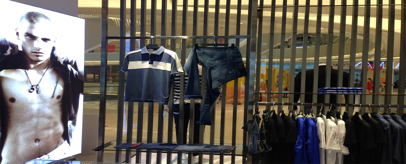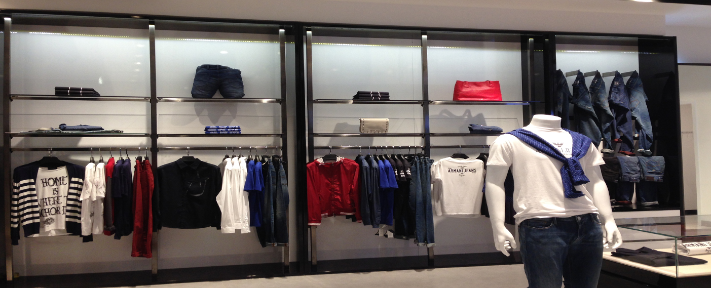 对于店铺内的环境照明,设计的时候需要考虑灯具的形式是否与空间环境协调一致,在布灯时尽量使灯位不干扰整体空间的设计语言。在Armani品牌店铺中,因为在室内设计时留有暗槽,平顶天花处为了保证天花的整洁度,与天花风格相匹配,在灯具的选用上平顶使用内嵌式射灯,做到见光不见灯。内槽处选用方形格栅灯匹配内槽风格,使得投射出来的光能覆盖到内槽边缘,也体现出天花的质感和线条感。